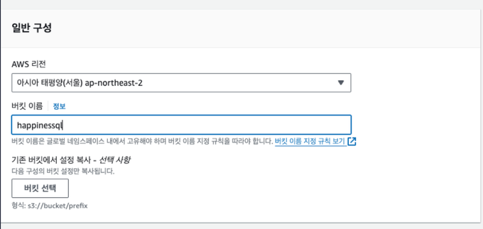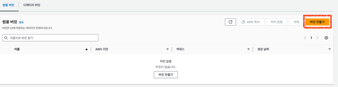 버킷 만들기 클릭버킷 만들기를 클릭하면 다음과 같이 뜨는데, 버킷 이름은 고유한 이름으로 설정해준다.