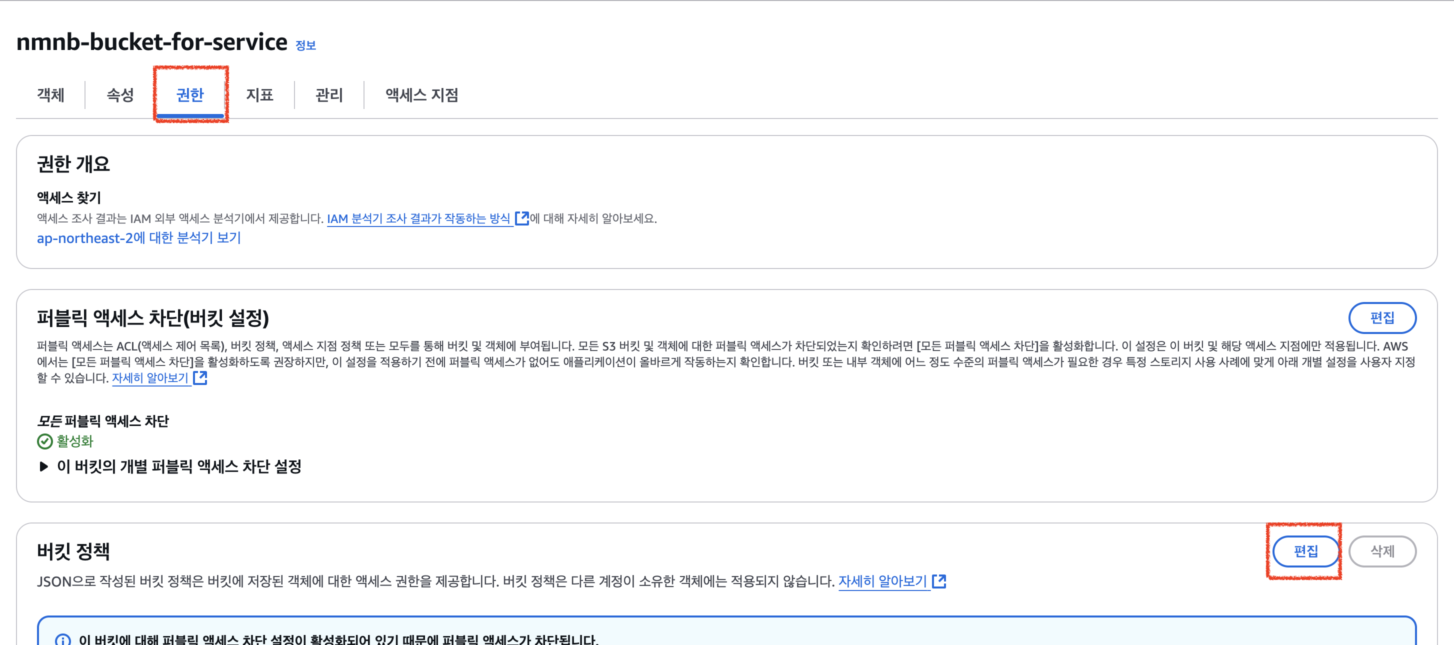 - 임의의 퍼블릭 버킷 또는 액세스 지점 정책을 통해 부여된 버킷 및 객체에 대한 퍼블릭 액세스 차단 : AWS 서비스로만 제한되며, 이 설정 활성화는 기존 버킷 정책에 영향을 주지 않는다.