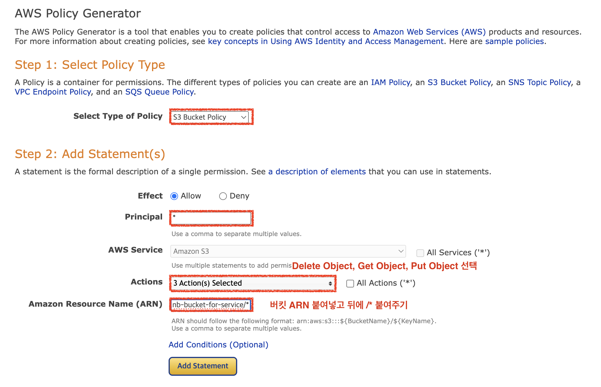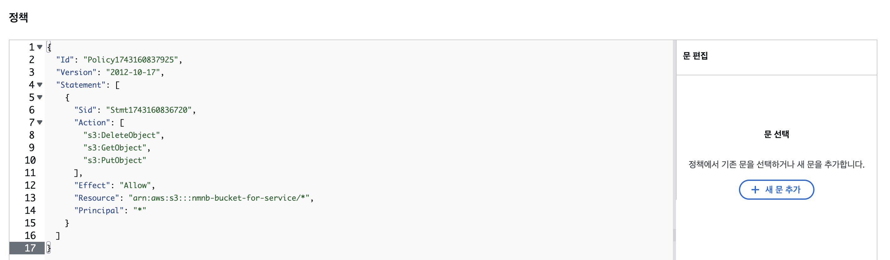 나는 사진 업로드, 조회, 삭제를 위해 Action을 위 3가지(GetObject, PutObject, DeleteObject)만 설정했다.