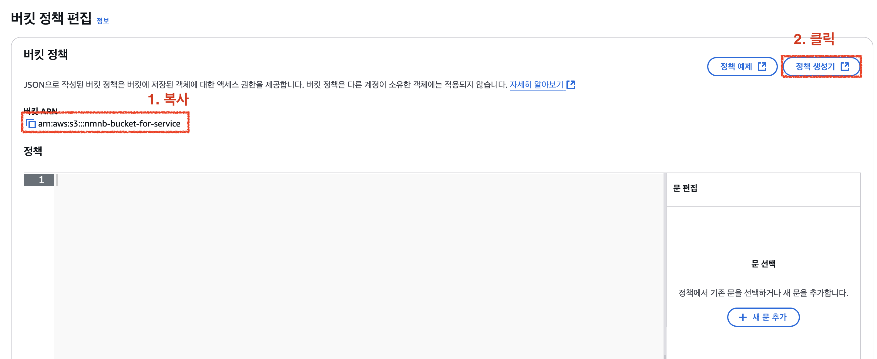 권한 -> 버킷정책 -> 편집 -> 버킷 ARN 복사 -> 정책 생성기에 접속한다.